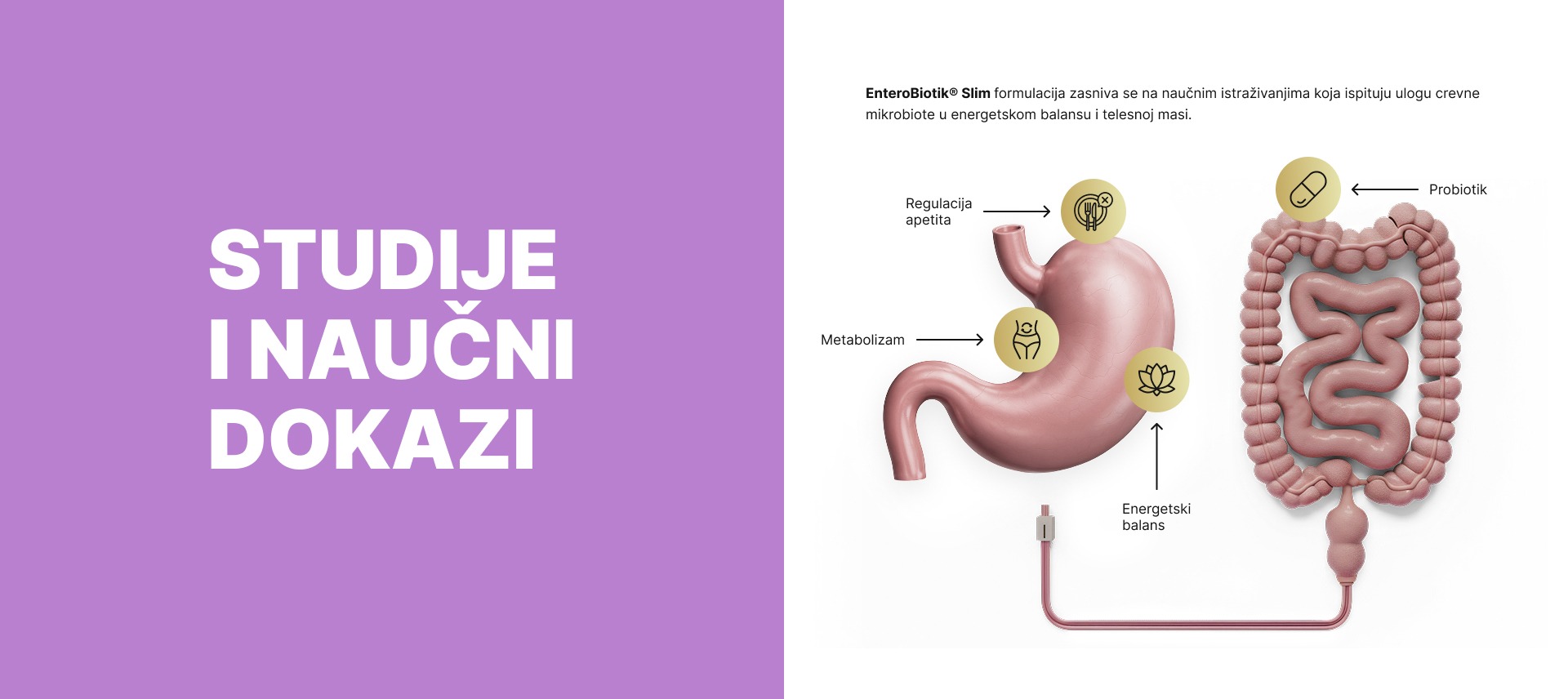 EnteroBiotik® Slim sadrži pažljivo odabran probiotski soj i aktivne sastojke koji utiču na mikrobiotu, hormone gladi i metabolizam, pa može pomoći u smanjenju apetita i podršci regulaciji telesne težine, uz uravnoteženu ishranu i zdrav stil života.